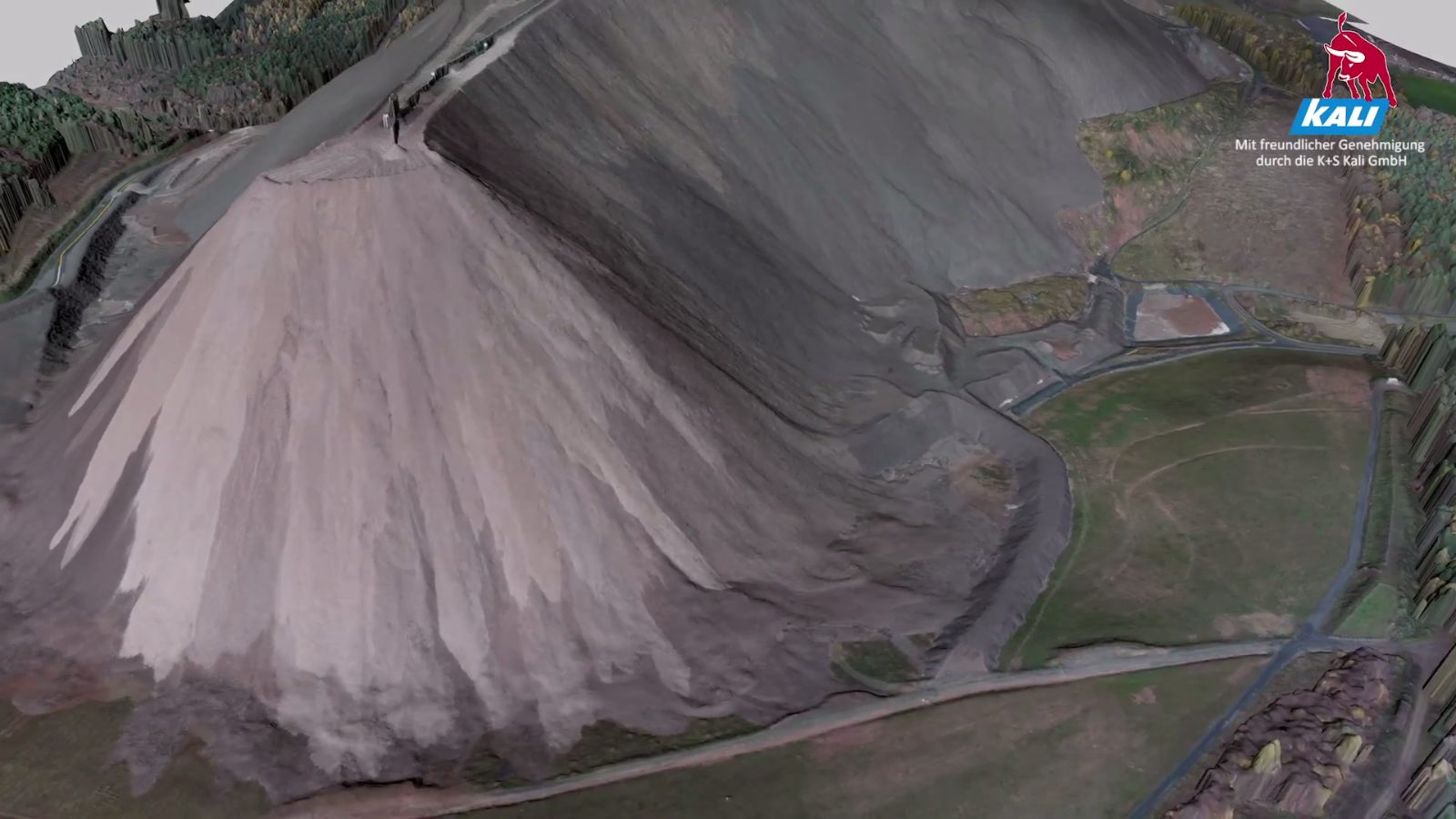 Projektbeschreibung: Ein sehr spannendes Projekt aus dem ersten Unternehmensjahr von GeoMon. Damals waren UAS noch ohne die RTK-Technologie unterwegs. Die Befliegung wurde mit einem der ersten MAVinci SIRIUS UAV (Serien-Nummer 5) durchgeführt. GeoMon konnte dank freundlicher Unterstützung der K+S KALI GmbH, Werk Neuhof-Ellers eine erfolgreiche Datenaufnahme des eindrucksvollen Kalibergs durchführen. K+S hat insgesamt 16 Kaliberg in Deutschland, dieser hier ist der südlichste. Zum Zeitpunkt der Aufnahme lagen hier ca. 108 Mio. t Salz (NaCl) als Abraum entstanden bei der Kali-Gewinnung auf Halde. Kali (KaCl) wird vorwiegend bei der Düngeherstellung verwendet.