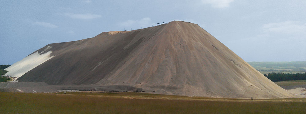 Abraumhalde „Kaliberg“ von K+S bei Neuhof (2013, Blick von Nordwesten). Durch die aktive Förderung des Bergwerks wächst der Berg kontinuierlich und verändert sein Äußeres.
