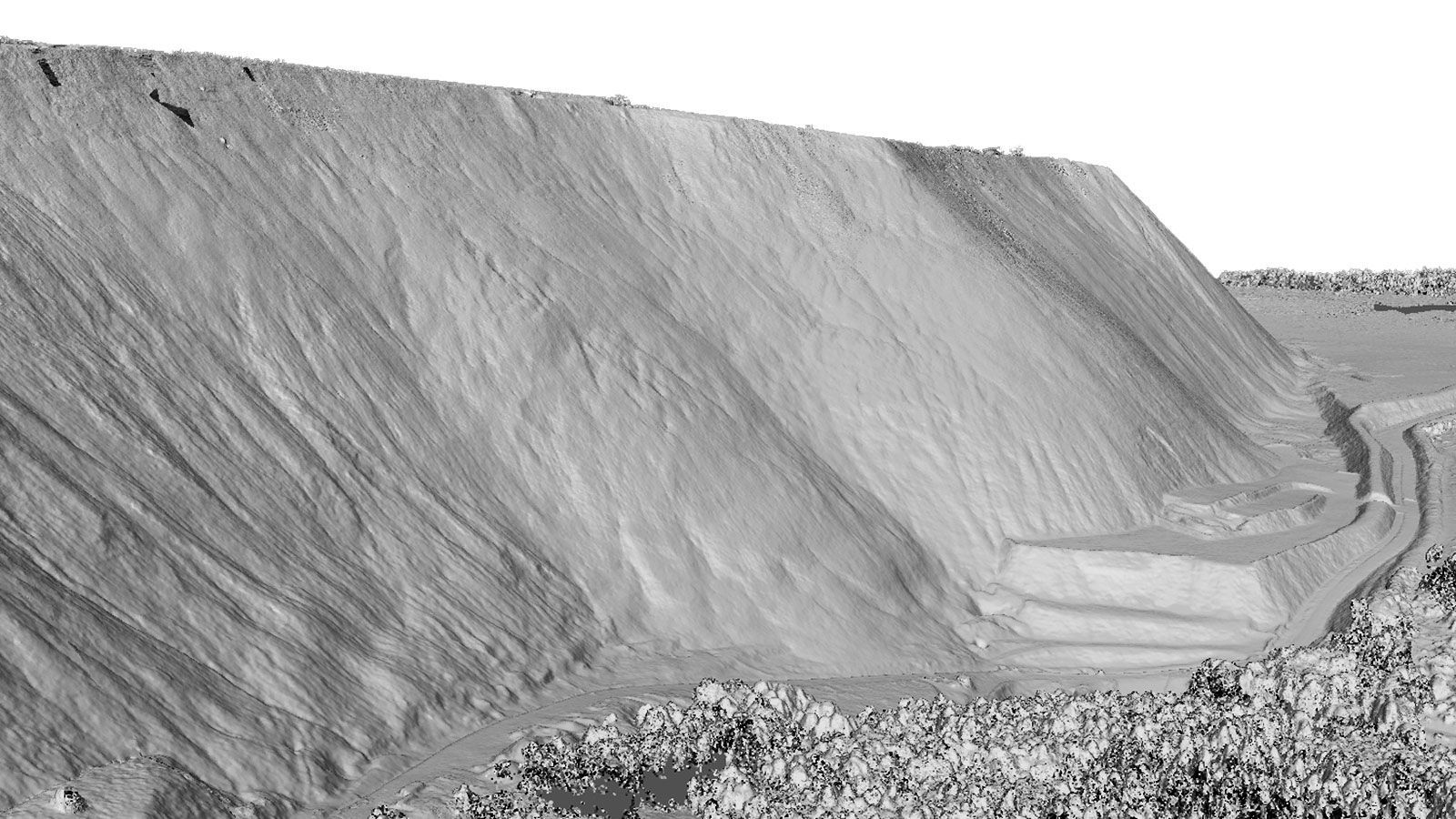 Ausschnitt der Dense Point Cloud des Kalibergs mit über 80 Mio. Einzelpunkten. Gut erkennbar im Bild: Die Salzoberfläche der Nordflanke, Fahrwege und Wallanlagen zum Schutz vor Rutschungen. Im Vordergrund stehen Bäume.